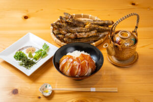 まずはお米の美味しさを堪能してもらう為、鯛の漬け丼で半分お召し上がりください。